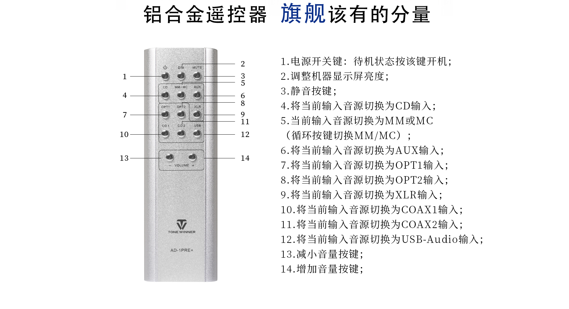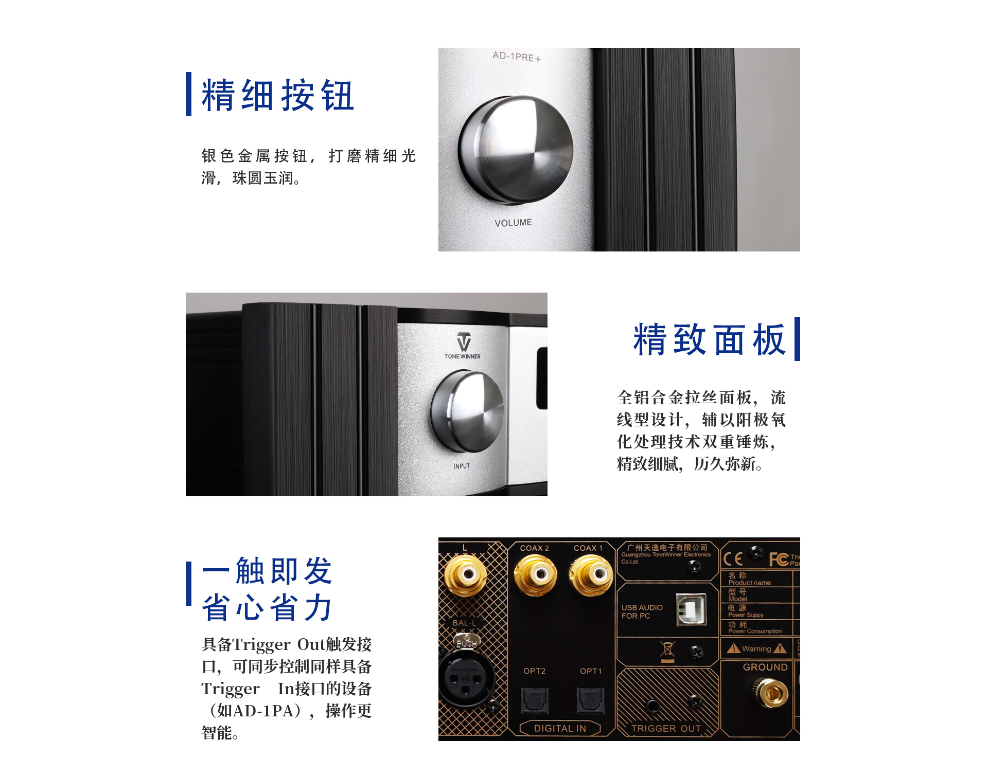 AD-1PRE+采用了精工拉絲工藝鋁合金面板,依然是以天逸一貫的黑白雙色鋁合金拉絲面板為基點,中間點綴了一塊非常精致的幽藍色字幕顯示屏。被打磨得珠圓玉潤的鋁合金音量旋鈕,再配上一只精加工的全鋁合金遙控器,緊湊而沉甸甸的手感,更彰顯出數位時代特有的HI-FI范兒!
