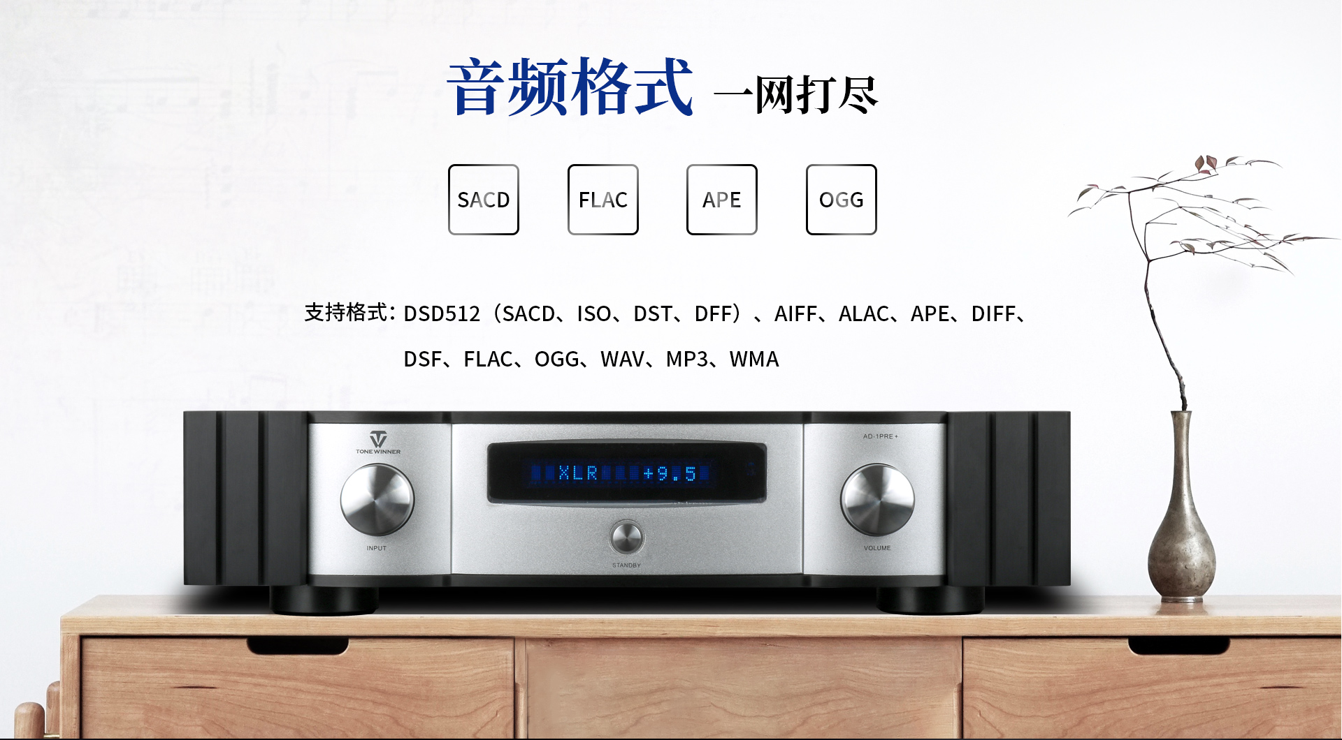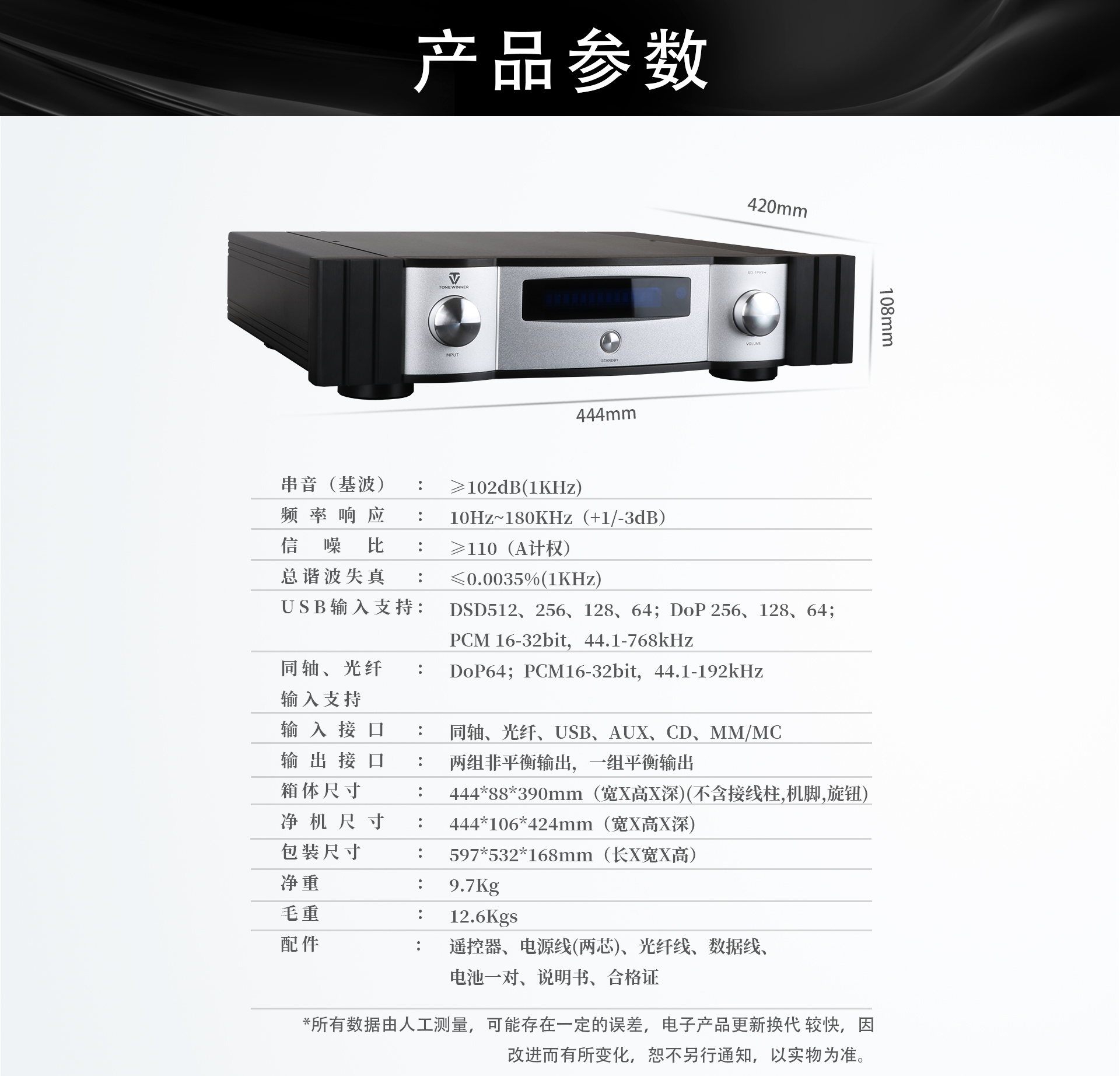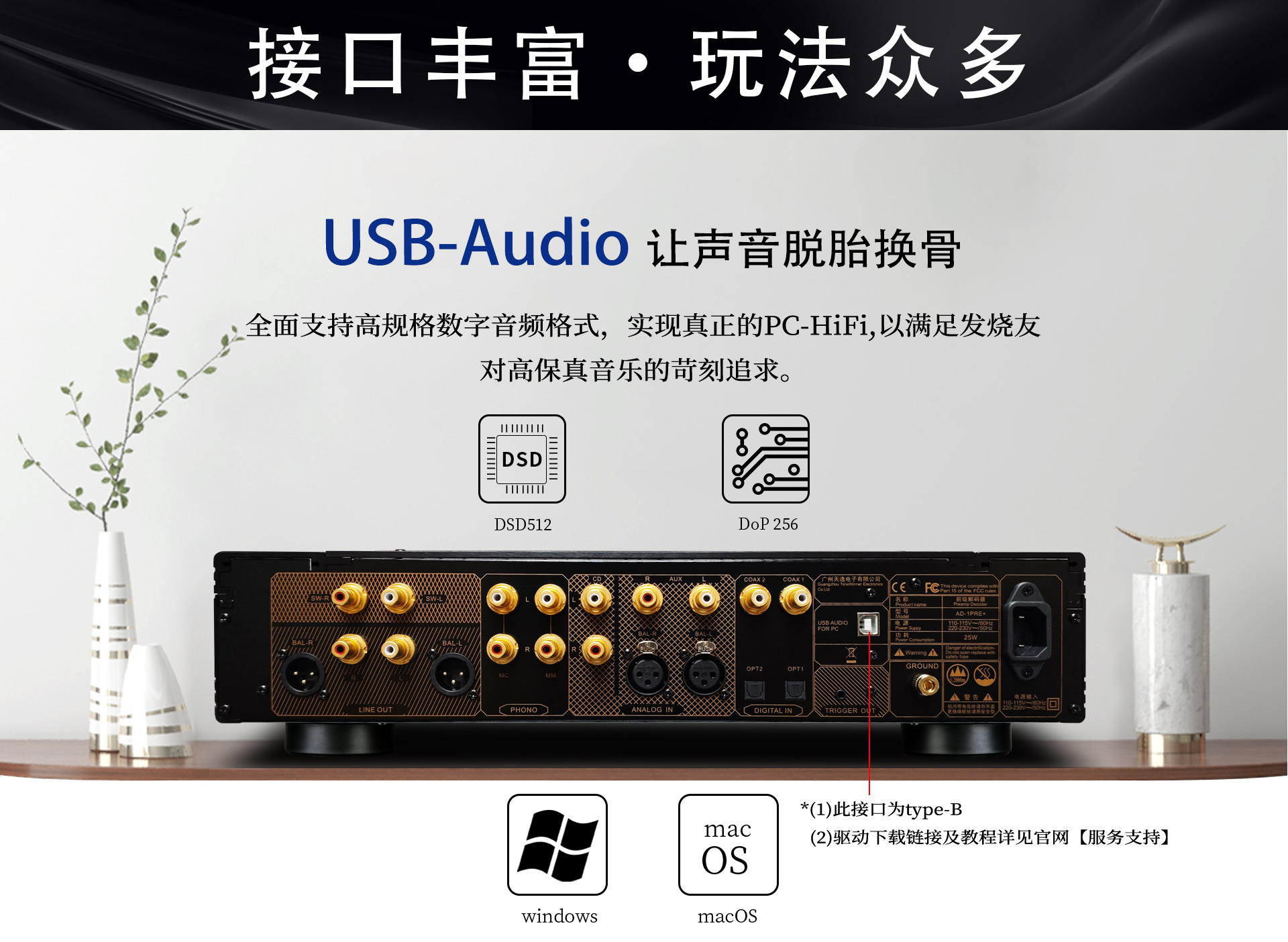 USB輸入支持:DSD512、256、128、64;DoP256、128、64;PCM16-32bit,44.1-768KHz