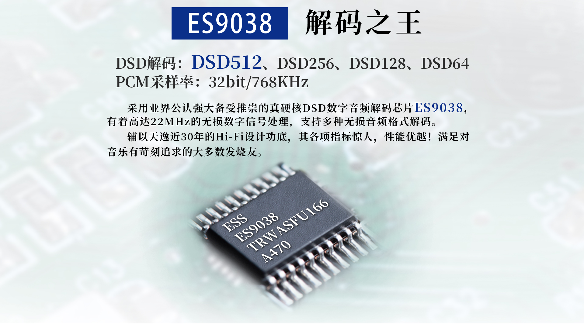2、DAC芯片采用了業界推崇的美國ESS公司的ESS9038,該DAC指標很優秀,該芯片信噪比高達129dB,失真度低至-120dB;