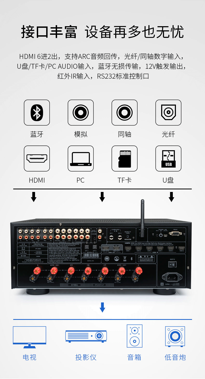 15.支持HDMI 6進2出,2組內軸2組光纖數碼音頻輸出,3組模擬音頻輸入;
