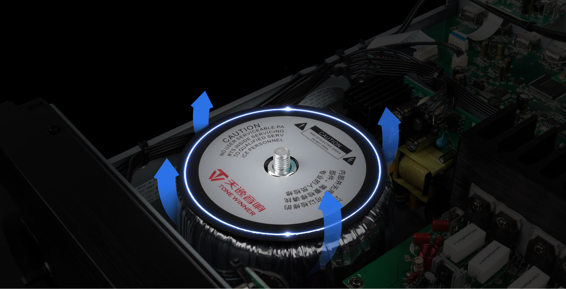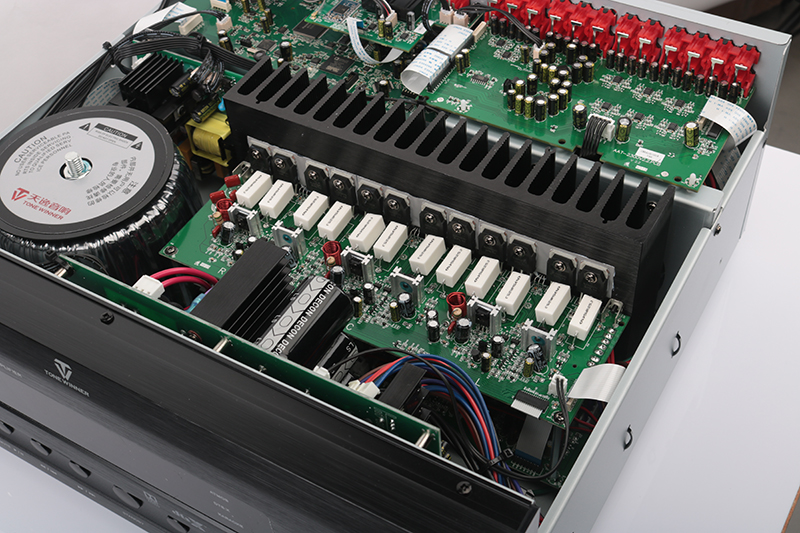 電源是整機的動力之源,自然不可忽視。因此天逸為AT-2300配備了巨型環牛,為機器提供7*150W(8Ω,RMS)的強大純凈動力。在它的加持下功放有著充足的動力,再加上92400μF的高品質大電解電容,提供了充沛的功率儲備!在這個級別的產品中非常罕見,可謂是下足血本,功放靚聲也是情理中事。