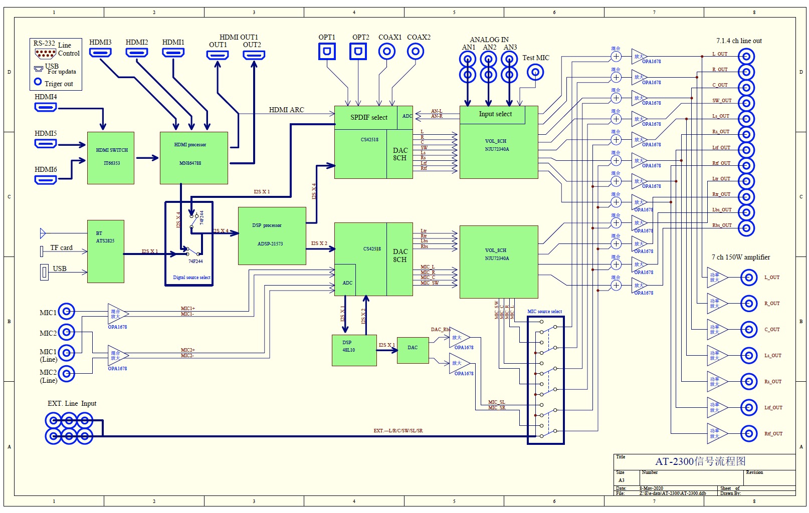 從AT-2300信號原理圖可見,機器的信號處理、放大過程相當復雜!所有的音視頻信號被送上了本機的信息高速公路進行快速的輸出輸入交換,從而完成高清解碼的全過程進入到相關的視頻處理顯示電路和多聲道高保真音頻模擬整形放大輸出電路等。