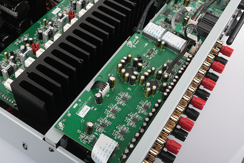 作為一臺創世代全景聲功放,高清解碼顯然是其至關重要核心部分!位于功放背板上方的特制多層沉金電路板集中了最核心的高清音視頻解碼、DSP處理及程序管理等。
