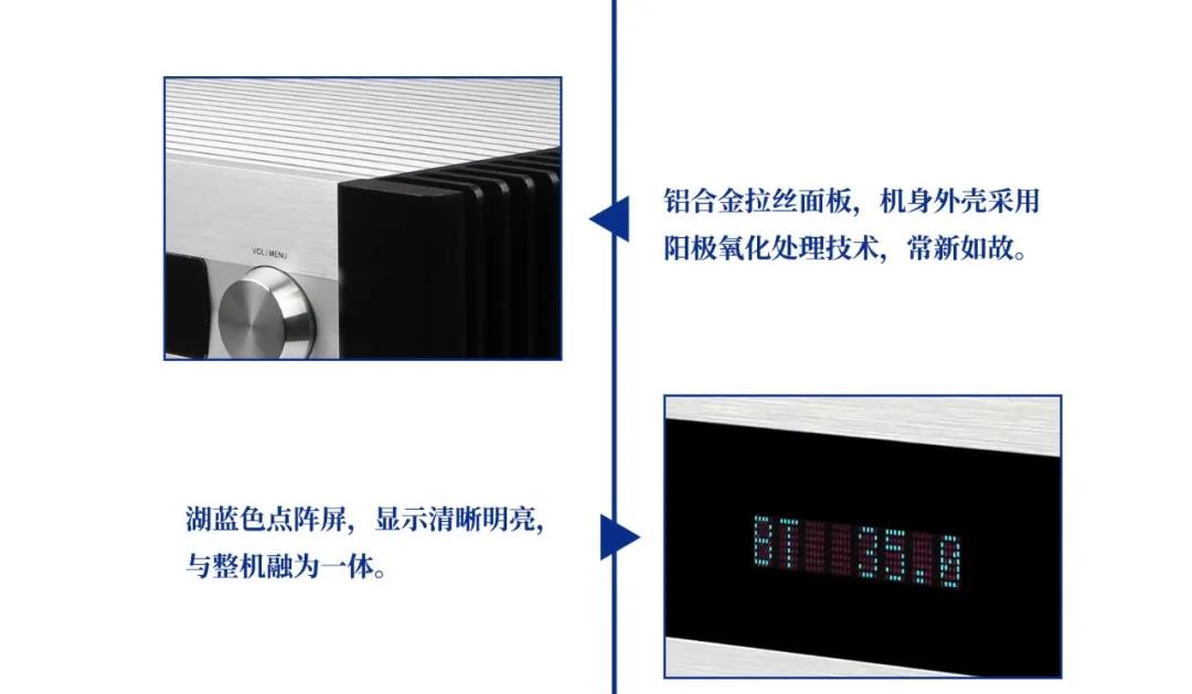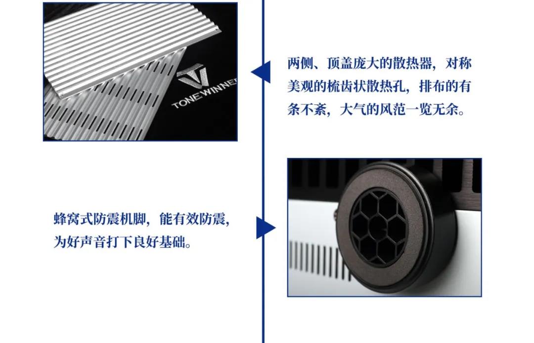 兩側(cè)和頂部均為梳齒狀蓋板,上面有條不紊地排布著散熱孔,加大散熱速率,同時(shí)梳齒狀設(shè)計(jì)讓整個(gè)機(jī)身簡(jiǎn)潔而不單調(diào),增加了整體造型的美感。底部有蜂窩式防震機(jī)腳,能有效減緩機(jī)身震動(dòng),為好聲音打下良好基礎(chǔ)。