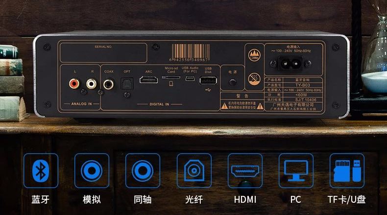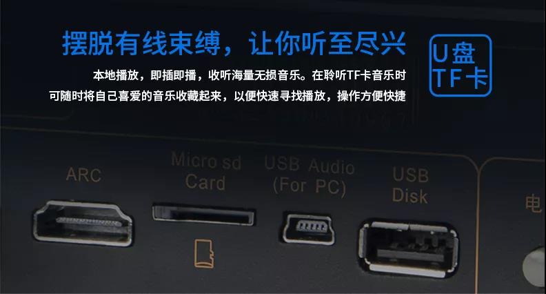 除了前面講到的TF卡/U盤本地播放接口外,TY-B03還支持模擬、同軸、光纖、HDMI等接口,可連接電視、音樂、游戲機等設備。