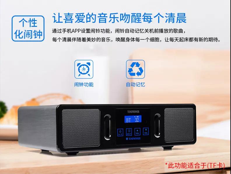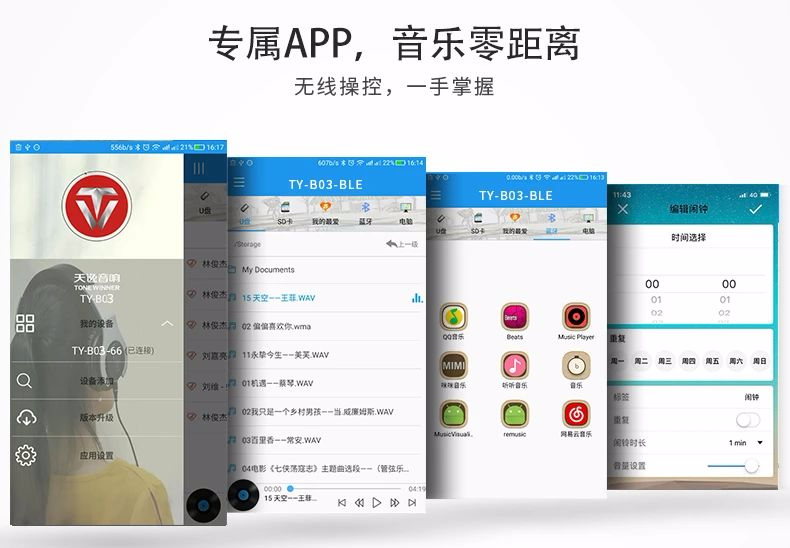 TY-B03還可以通過手機APP進行鬧鈴功能設置,可以設置自己喜愛的音樂作為鬧鈴,它也會自動記憶關機前播放的歌曲,有了它,每天起床都是美好的開始!