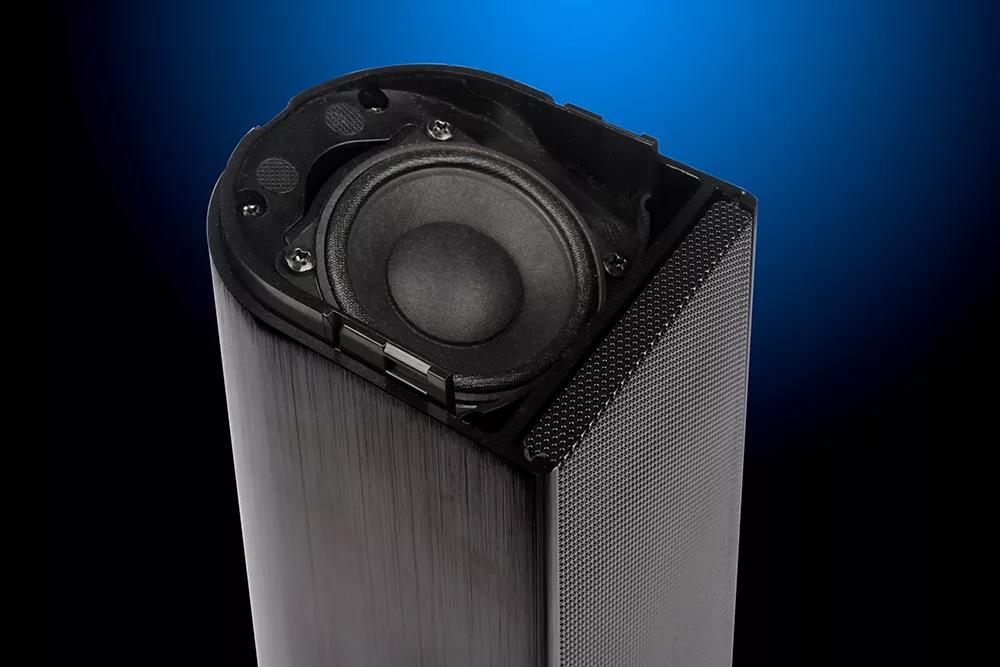 前置單元是采用兩只3寸強磁鋼全頻單元,其材質使用原木纖維紙盆,保證聲音能很好的還原,并采用了開孔式金屬盆架和多股纏繞無氧銅音圈設計,使其聲音收放輕盈;而頂置單元選用的是一只2.25寸內磁高靈敏、低失真專用全頻單元,嚴格按照DOLBY-ATMOS技術要求及測試指標,傾斜安裝于音箱頂部,與水平面形成特別的反射角度,當喇叭發(fā)聲時,其聲波會以特定的角度射向房間天花板上,再被放射性的折射下來,覆蓋在聆聽者的頭頂部位,配合前/后/左/右的聲源,形成一個三維的立體包圍聲場。