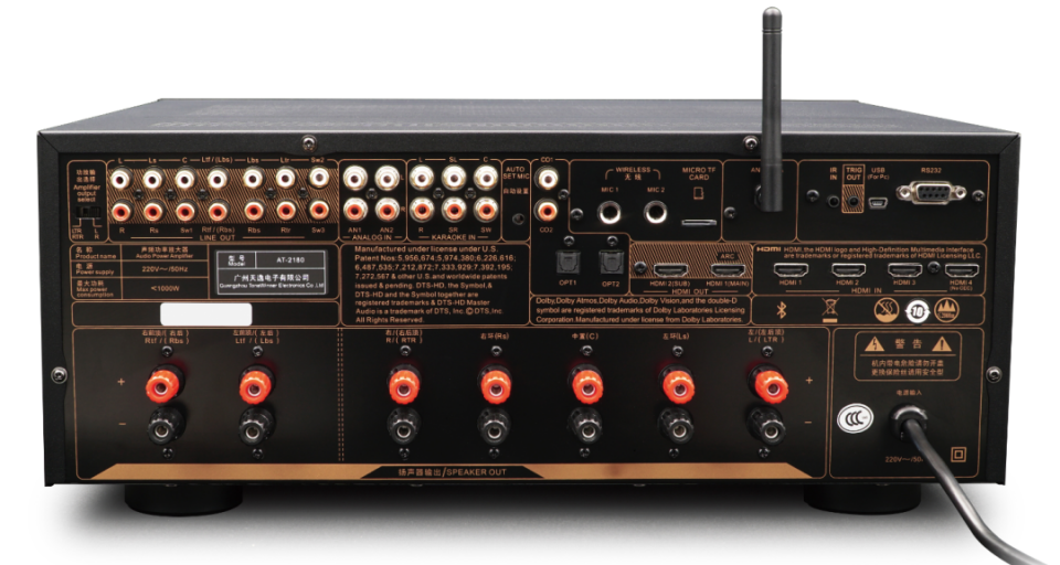 AT-2180支持DOLBY-ATMOS、DTS:X雙解碼,以及向下兼容高清音頻格式。通過專業的全景聲DSP算法,讓聲音在三維空間盡情釋放,不論是在專業影音室還是客廳空間,聲音效果都能精確展現。同時通過Dolby Surround 和DTS Neural:X技術進行獨特空間定位,即便是非全景聲音源的影片也可呈現全景聲效果。