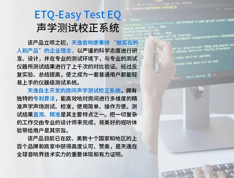 2022年4月,天逸正式推出一款自主研發(fā)的ETQ聲學(xué)測(cè)試校正系統(tǒng),目前該系統(tǒng)已應(yīng)用于天逸多款全景聲影K功放產(chǎn)品中,并在歐、美數(shù)十個(gè)國(guó)家和地區(qū)的上百個(gè)品牌和商家中獲得高度認(rèn)可、贊美,是天逸在全球音響界技術(shù)實(shí)力的重要體現(xiàn)和有力證明。