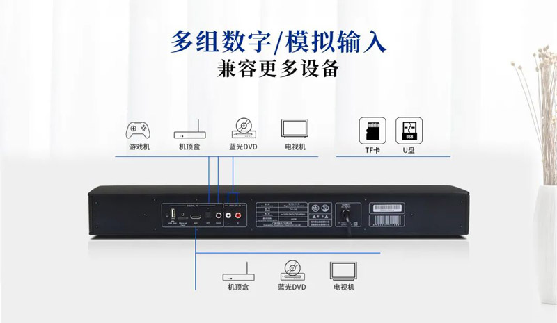 TV-20/L電視音響支持128gU盤、TF卡本地播放,支持WAV、FLAC、APE等音樂格式;支持專屬APP控制,支持15米有效范圍藍牙無線傳輸,性能優越,縱享高清流暢觀影體驗;多組數字/模擬輸入,能夠連接高保真數字播放器、CD機,兼容更多設備。