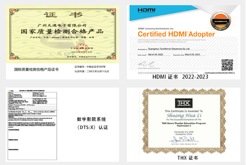 在此方針指導下,天逸緊跟行業(yè)最新音視頻標準,并成為國內第一家同時獲得美國DOLBY-ATMOS(全景聲)、DTS:X(沉浸式音效)、HDMI2.1技術認證和授權的國家高新技術企業(yè)。