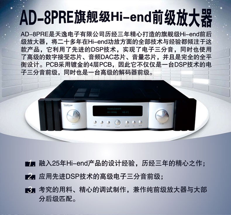 AD-8Pre是Hi-end前級,它利用了最先進的DSP技術,實現了電子三分音,同時也使用了當今最頂級的數字接受芯片、最頂級音頻DAC芯片、最頂級的音量芯片,并且是完全的全平衡設計。PCB也是鍍金的4層PCB,因此它不僅僅是一臺DSP技術的電子三分音前級,同時也是一臺最頂級的解碼器前級。AD-8PA是與之配套的六通道純后級,可以獨立驅動左右聲道高中低音共6路揚聲器單元。它采用天逸公司最優秀的全平衡Hi-end功放電路,并擁有巨量的電源供應、巨量的功率管合并驅動,采用甲類工作方式,并精心挑選材料,精心調校制作,使得它不僅推力驚人,而且音質完美。總之我們希望AD-8Pre/AD-8PA是一款能給發燒友帶來驚喜的極品放大器。