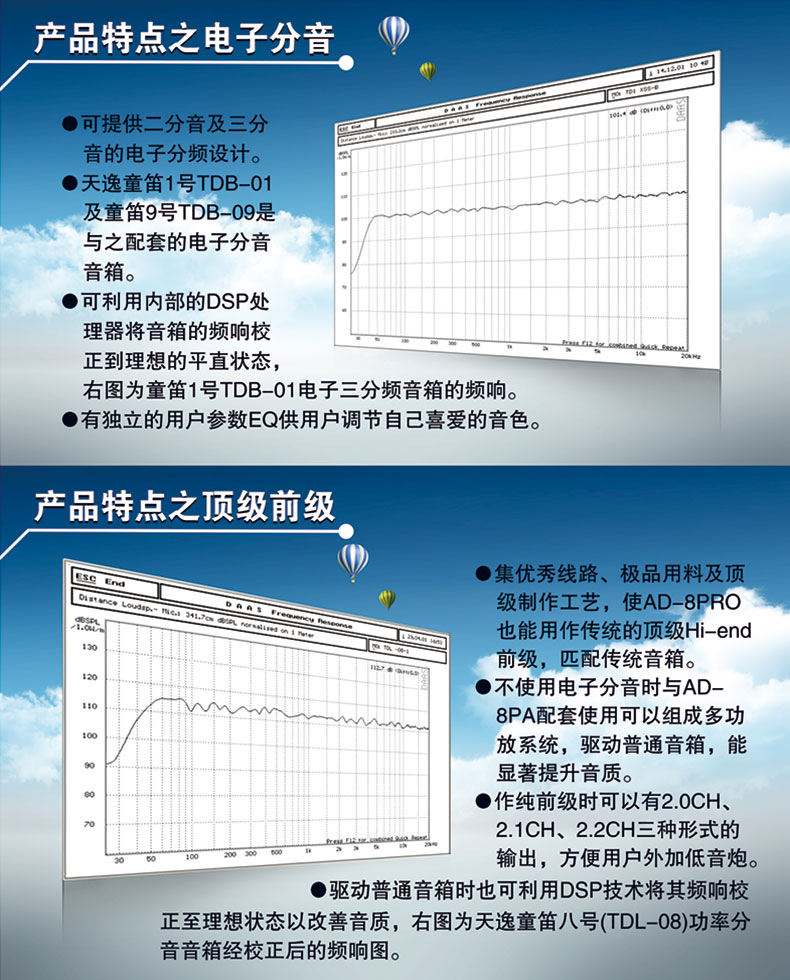 AD-8PRE/AD-8PA前后級電子分頻HI-END功放,屬于天逸嘔心瀝血開發研制的迄今為止天逸最高端旗艦級高保真功放,這是天逸音響多年來積累的高保真功放之經驗和時下音響業界DSP數字聲效高新技術結合的完美產物,該產品可配兩分頻、三分頻HI-END級書架箱或落地箱玩電子分音,也可配合任何品牌的傳統高保真音箱玩雙功放分音,亦可配合任何高保真音箱和有源低音炮玩雙功放+2.1高保真系統。玩法很多,音質音色堪稱完美!值得對音質音色有極嚴格的要求、追求極致音質的骨灰級音響發燒友關注和購買。