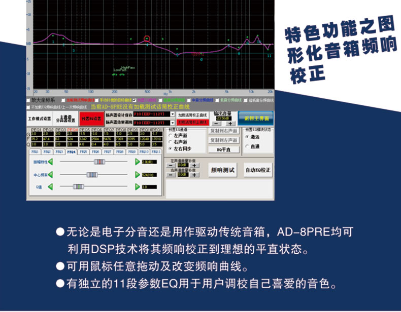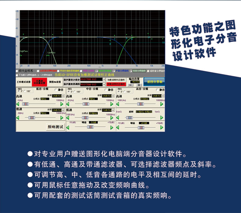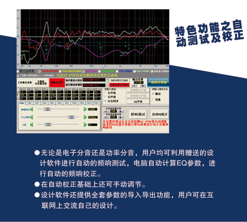 ●無論是電子分音還是功率分音,用戶均可利用贈送的設計軟件進行自動的頻響測試,電腦自動計算EQ參數,進行全自動的頻響校正。