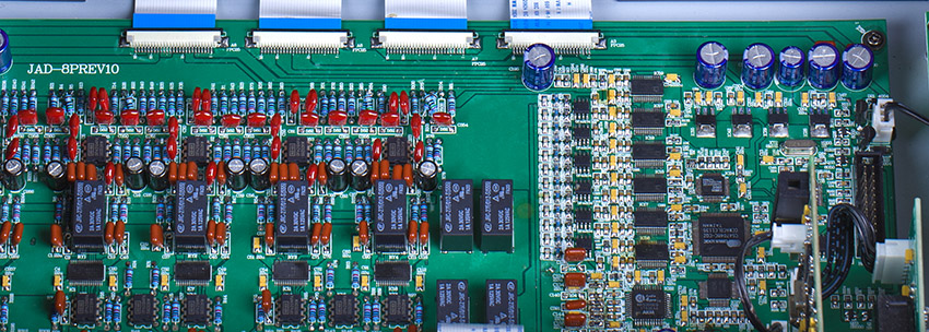 除以上之外,AD-8PRE在別的材料選用上也毫不含糊,整機共用了23只BB公司的高級運放OPA2134,音頻耦合電容全部采用ELNA的音頻專用高級電容以及CBB電容,濾波器、電源等退耦電容也都選用高精度的金屬膜電容。電阻均選用低噪聲的金膜電阻。信號切換全部采用高級繼電器而非電子開關。
