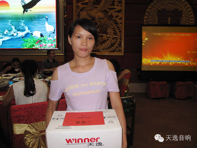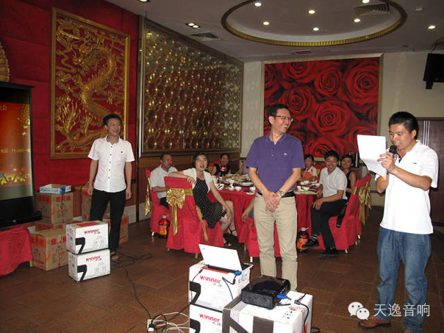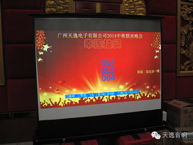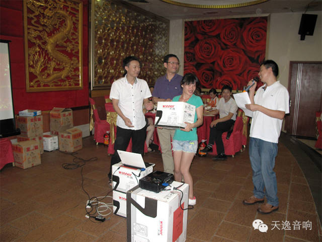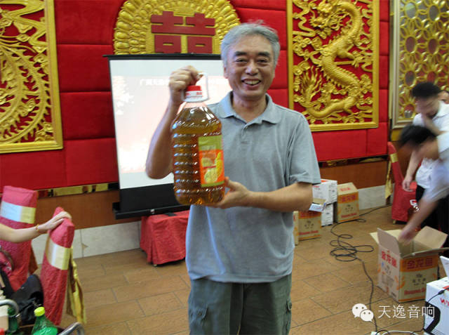 晚宴中穿插了4輪抽檢活動,設立了30個中獎機會:三等獎獎品為24桶5升裝的精煉花生油,二等獎為價值980元/臺的天逸高保真多媒體音響TY-D03 5臺,一等獎為價值2580元的天逸高保真電子分音多媒體音箱TY-D01一臺。獎品豐厚,中獎幾率較高,因而晚宴會場常有高潮迭起,歡呼雀躍!