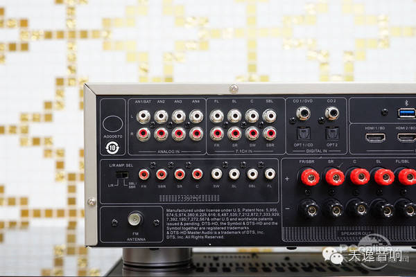 是功放的背面,接口非常豐富,足以滿足所有用戶的挑剔需求,提供了完整的7.1輸入(包括4組RCA輸入)、兩組光纖輸入、兩組同軸輸入、4路HDMI1.4輸入、FM天線以及3.0藍牙輸入、1路HDMI輸出,該機還增加了7.1聲道前級解碼模擬音頻信號輸出電路,搭配好音響后,用戶可以盡情享受最震撼的7.1聲道家庭影院效果。