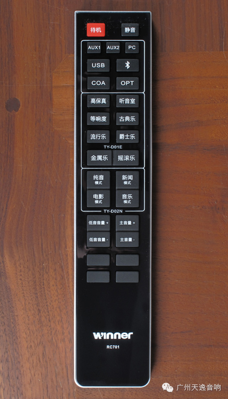 在去年TY-D01的銷售使用的過程中,我們曾收到大量消費者使用的反饋意見,都反映該套音響的質量不錯,性能穩定,音質細膩,音色美艷,的確可以媲美同價位的HI-FI音響組合!但是也有很多朋友向我們反映,說由于該套音響沒有日常使用的遙控器,雖然功能眾多,但在調整音量大小、選擇各種出廠設置的音效音場模式、選擇各種音效、高低音音量調整、以及音源切換等操作甚為不便。尤其這些控制調整旋鈕、開關等是設計在主音箱低音炮背板上的,而平時低音音箱的背板并不是面對使用者擺放得,這就意味著當您要選擇音源輸入、調整音響音量已及調用各種出廠預置的音效模式時,必須繞到音箱后方背板面才能動手調整。當然,也完全可以借助USB線連接電腦進入到直觀明了的DSP電腦操控界面,對音響的各種各樣的音效音色、EQ、高低音等進行有效的調整。但這些操作畢竟都不太方便,尤其是用于平時簡單的開機聽幾首流行歌曲,僅僅是選選音源,簡單的調大調小音量、簡單的增加低音炮的低音或是減少低音炮的低音都不是很方便。我們需要的就是方便快捷,就是用遙控器即可方便控制的便利。所以我們在第二代TY-D01E中,增加了一只方面可靠的25鍵紅外線遙控器,很多調整都可以在這只遙控器上來實現,這就大大的方便了用戶。
