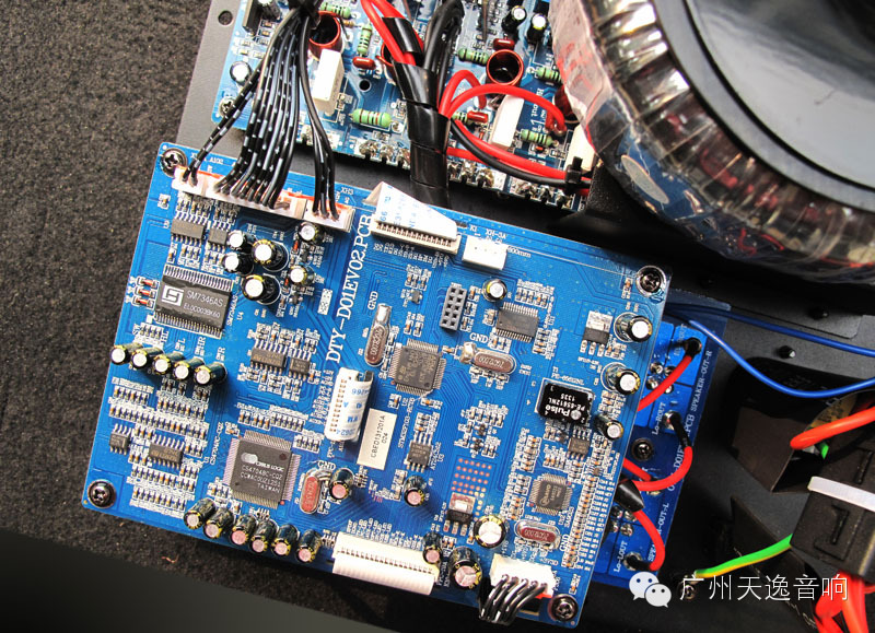 這5張小小的電路板分別為左聲道低音喇叭功放、左聲道高音喇叭功放、右聲道低音喇叭功放、右聲道高音喇叭功放、低音炮喇叭功放。需要注意的是,這5個聲道是完全獨立的哦!