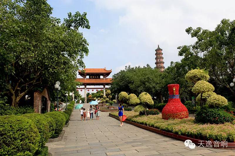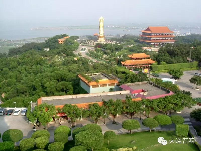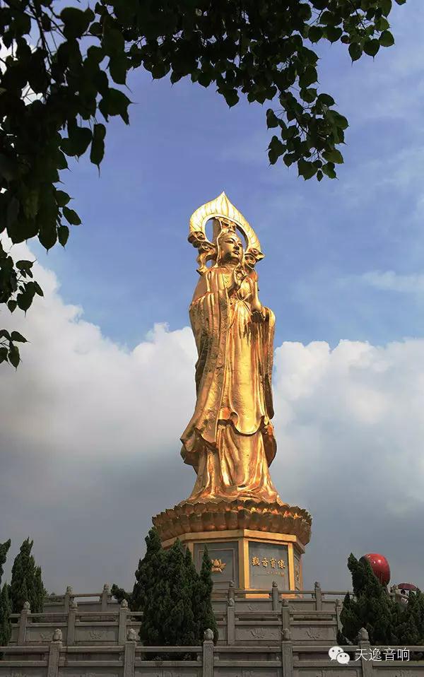 舉目瞻仰,湛藍的天空中一朵朵白云飄浮天際,襯托著觀音菩薩好像騰云駕霧,彩霞披身。觀音像高40.88米,用120噸青銅鑄成,外貼純金180兩,是目前世界上最高的箔金觀音銅立像。觀音寶像面向東南,遙望浩瀚的獅子洋,“望海觀音”因而得名。