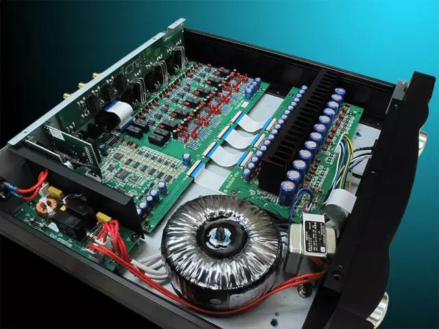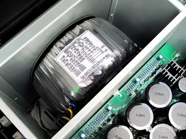 開蓋可見該機(jī)內(nèi)部電路板的密密麻麻排滿了各種高品質(zhì)的電子元件,排版布線及其專業(yè),絕對是音響名廠的發(fā)燒大手筆: