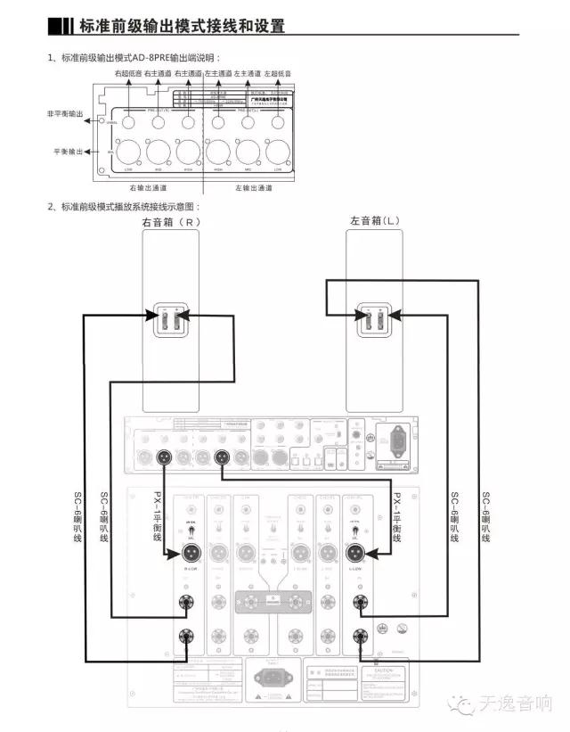 今天我們就向大家介紹第三種配箱接線玩法:將AD-8PRE/AD-8PA作為標準前/后級功放使用,搭配任何其他品牌的(音箱內帶功率分頻器)的高保真音箱: