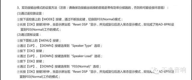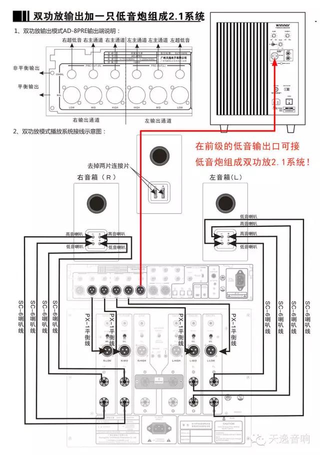 將AD-8PRE/AD-8PA作為雙功放輸出,搭配其他品牌的音箱,并增加一臺低音炮加強低音和現場感效果,也是一種是對音質和音色個性化要求極高的發(fā)燒友喜歡的一種高級玩法。當然,雖然這種玩法并不為大多喜歡原汁原味的HI-FI音響發(fā)燒友所認同,但也值得試試,現在我們就將這種玩法向您介紹具體的功放與音箱的接線和功放的設置方法: