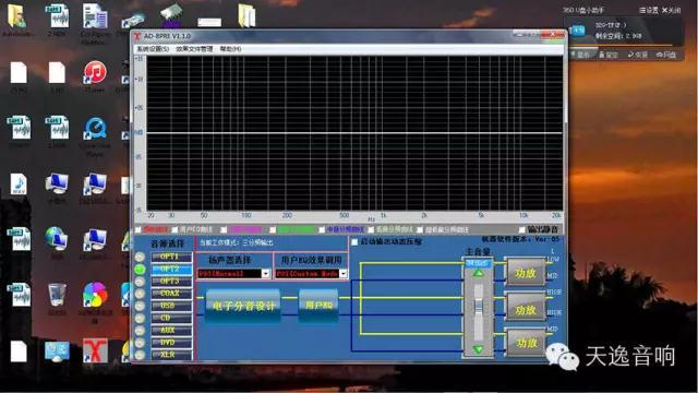隨后,需要打開超低音輸出:用USB線依照以下圖示將AD-8PRE前級和電腦筆記本連接好,電腦里預先要裝好名為 “ AD-8PER音頻效果管理專家 ” 的隨機附帶調音軟件。