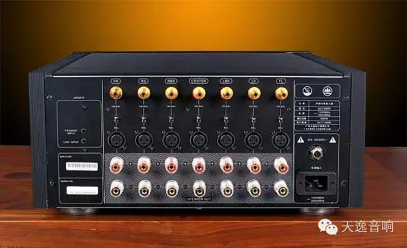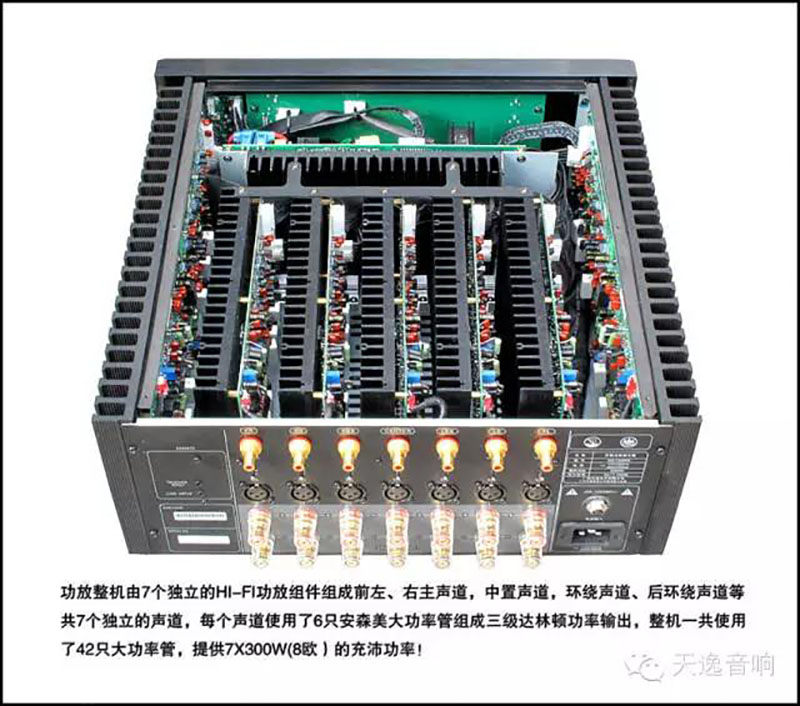 這是一個非常經典且好評如潮的高保真HI-FI電路,天逸的絕大多數HI-FI功放幾乎都是采用了這個電路(譬如著名的AD-68、AD-8PA等HI-FI名機),似曾相識吧?該電路輸入部分采用了可供選擇的平衡/非平衡輸入,超低噪聲雙差分放大電路和鏡像恒流源負載,此舉可以極大的提升整機的信噪比,提升電壓放大級的電壓增益和穩定性,展寬聽閾范圍的頻響,第二級為共基電路放大及鏡像恒流源負載,目的是進一步提高電壓增益并有效改善電路放大級的線性特征,使其更加適合家庭影院的高聲壓動態大、驅動力強、轉換速率高等需要,為提高功放電路自身的穩定性和可靠性,電路末級特意設計了溫度補嘗電路及直流伺服電路并設計了適量的負反饋電路以確保該機的穩定。最后經由3對著名好聲的安森美NJW0302G/NJW0281G音頻專用大功率管以三級達林頓電路組成推挽輸出,提供每聲道300W、8歐的強大功率。全機一共7個聲道,42只NJW0302G/NJW0281G大功率管可謂真容非常強悍!