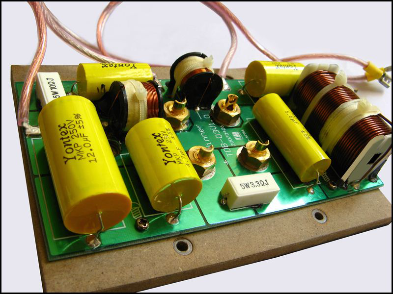 分頻器的高音通路為三階巴氏濾波器,選用高品質MKP電容、空芯電感制作;中低音通路為二階巴氏濾波器,選用音箱專用無極電容、粗線徑電感制作。在利用電腦進行許多次測試、分析、調校之后,該分頻器將各頻段融合得非常好,且相位失真很小。