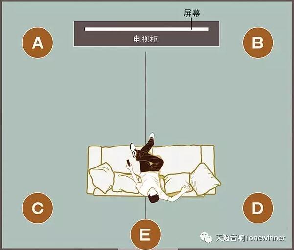 如下圖,ABCDE都是低音炮可以擺放的地方,當然為了好看,大家會盡量選擇將它放置在一個比較偏的地方,一是好看,二是不妨礙家人的活動。