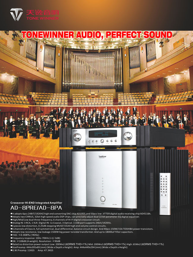 此次參加CES展,除了傳統的發燒音響:天逸最高旗艦高保真電子分音前后級功放AD-8PRE/AD-8PA及與之相配的高保真書架音箱TD-09、TY-20發燒級CD機以及SUB-1280低音炮以外,還揭開了天逸最新成果的面紗。