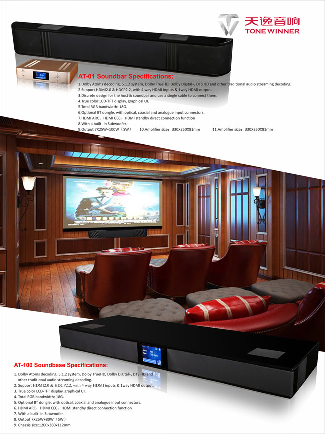 天逸全景聲Soundbase全景聲高保真影院音響,同樣采用最新音頻技術——Dolby Atmos,將功放與音箱結合于一體,配合大屏幕高清電視打造,適用于現代客廳的音響產品。該全景聲產品外觀簡潔大氣,安裝方便,可直接置于電視之下,不受空間、線材等束縛,和任意室內環境均可完美融合。全景聲技術的應用,使用戶擺脫傳統家庭影院的束縛,在三維空間里給出聲音的立體座標位置,感受“移動的聲音”。