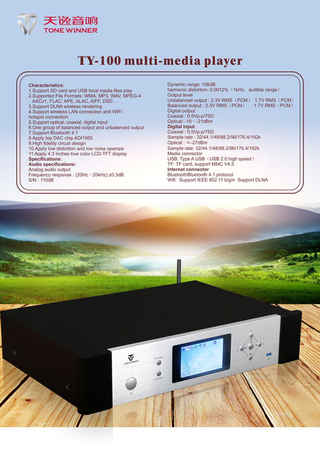 網絡音樂播放器已不再是新奇產品,但國內市面上對于其聲音的調校和高保真發燒理念的定位并不十分明確。TY-100是天逸憑借企業二十余年的音響研發經驗,融入最新的數碼高新科技和傳統經典的HIFI電路及調音技術研發而成,旨在為廣大鐘情于HIFI純音樂的發燒友謀福祉。TY-100是一臺真正擁有高保真理念的網絡播放器,完全可以與一款中檔CD機媲美。