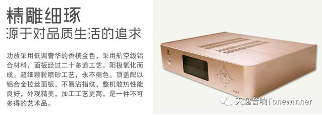 功放采用低調奢華的香檳金色,采用航空級鋁合材料,面板經過二十多道工藝,陽極氧化而成。超細顆粒噴砂工藝,永不褪色。頂蓋配以鋁合金拉絲面板,不易沾指紋,整機散熱性能良好,外觀精美,加工工藝更高,是一件不可多得的藝術品。
