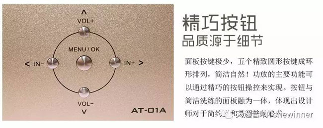 面板按鍵極少,五個精致圓形按鍵成環形排列,簡潔自然!功放的主要功能可以通過精巧的按鈕操控來實現。按鈕與簡潔洗練的面板融為一體,體現出設計師對于簡約型和易用性的追求。