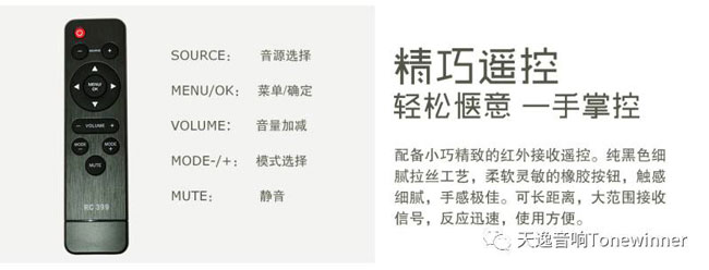 配備小巧精致的紅外接收遙控。純黑色細膩拉絲工藝,柔軟靈敏的橡膠按鈕,觸感細膩,手感極佳??砷L距離,大范圍接收信號,反應迅速,使用方便。