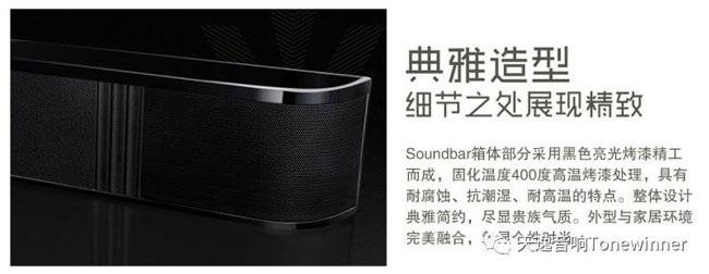Soundbar箱體部分采用黑色亮光烤漆精工而成,固化溫度400度高溫烤漆處理,具有耐腐蝕、抗潮濕、耐高溫的特點。整體設計典雅簡約,盡顯貴族氣質。外型與家居環境完美融合,彰顯個性時尚。