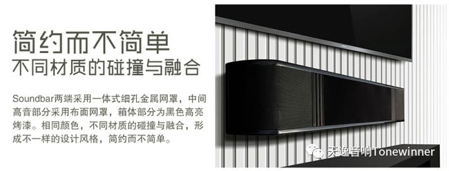 Soundbar兩端采用一體式細孔金屬網罩,中間高音部分采用布面網罩,箱體部分為黑色高亮烤漆。相同顏色,不同材質的碰撞與融合,形成不一樣的設計風格,簡約而不簡單。