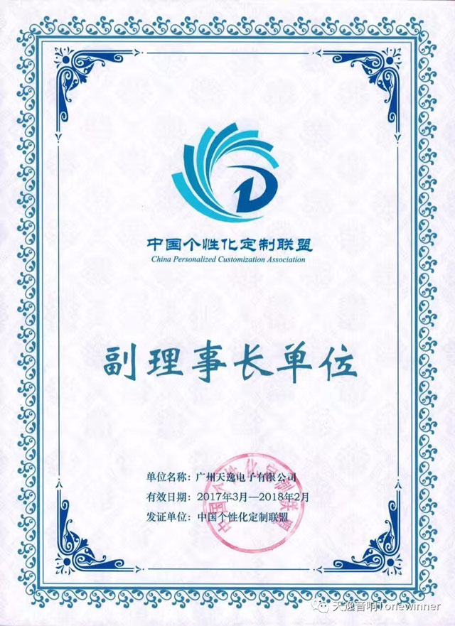 廣州天逸電子有限公司作為國內知名的音響制造企業之一,此次應邀擔任《中國個性化定制聯盟》副理事長單位,必將會在聯盟全面落實《中國制造2025》戰略部署、加快制造與服務的協同發展、推動商業模式和業態創新等方面產生積極作用,同時,將依托理事會平臺,在個性化定制等新領域,與其它國內外知名企業加強對接,為打造能源國際投行提供有力支撐。