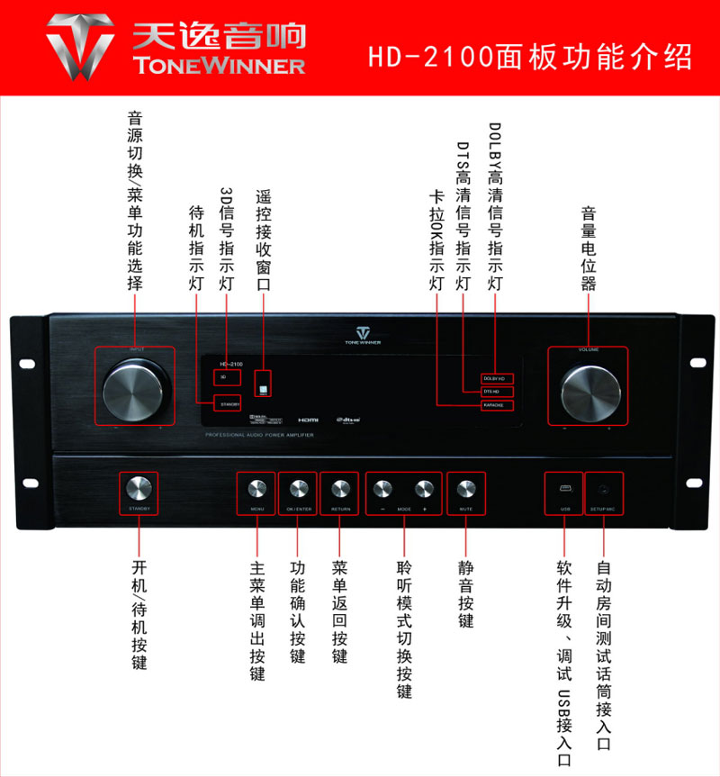 HD-2100專業高清3D影K一體機,是由美國THX認證工程親自研發設計,且獲得并通過美國Dolby、DTS、HDMI高清音視頻認證;是為專業高清影K市場而研發的一款多功能、高性價比的3D高清影K一體化功放;其功能強大、性能穩定、音質效果一流、具有超高的性價比,是影吧場所首選的專業設備。