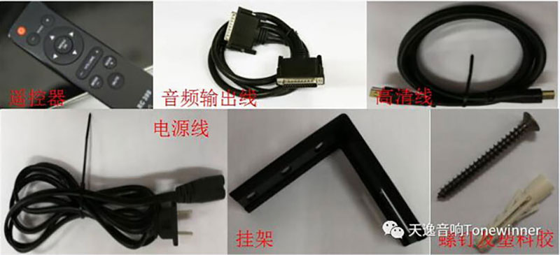 打開AT-01A功放的包裝后,里面豐富的內容一覽無遺:一臺全景聲影院功放,一只精美的遙控器,一條高品質2.0版本HDMI高清線,一條連接功放與音箱的特制音頻輸出線,一條電源線,另外還有保修卡、合格證、說明書等;而體積稍大的音箱包裝內,除了一只工藝精湛的亮黑音箱外,還有兩只掛架、六顆螺絲釘及六粒塑料膠釘等配件。