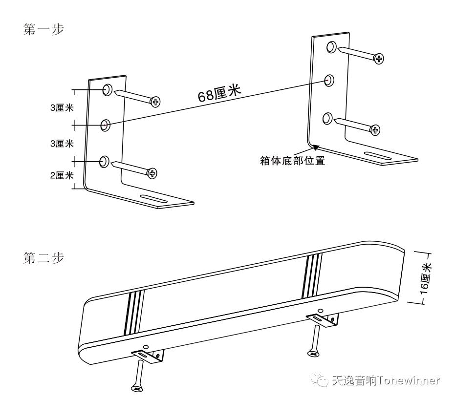 選擇合適的位置將兩個掛架水平安裝在墻壁上,將音箱底部的安裝螺絲釘取下,把音箱放在掛架上后,再裝上底部左右各一螺絲固定。