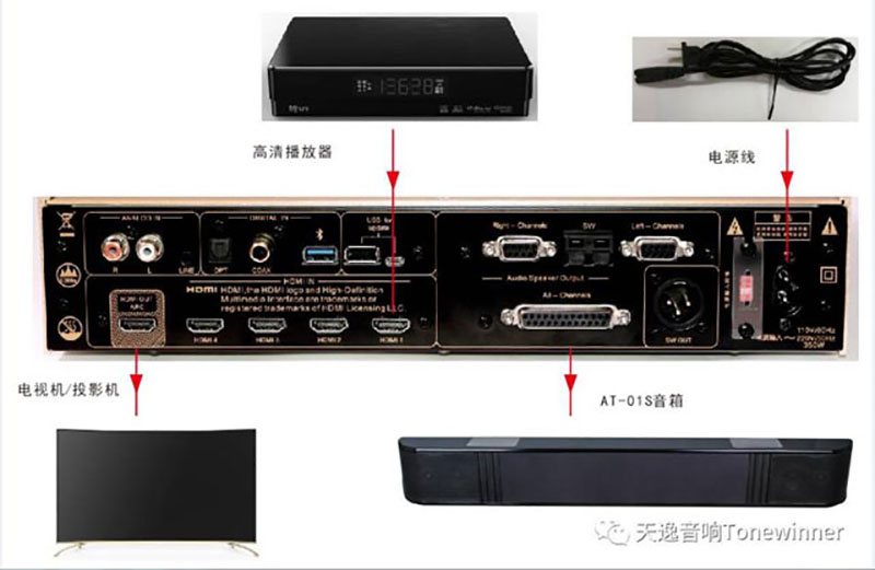 以高清播放器為輸入源為例,可按照上圖連接方式,構成一個完整的音視頻系統。