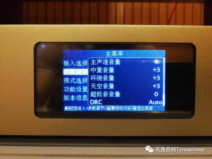 該菜單里有各個聲道的獨立音量調節。功放在出廠設置已經經過工廠嚴謹的聲場設置,可以滿足85%以上用戶的家庭使用環境。若在使用中覺得全景聲效果不明顯,那么您可以根據客廳大小、布局、聲學條件來任意調節,每個聲道都有-10dB--+10dB的音量調整范圍,足夠應付您對各個聲道音量大小調整的需要。譬如您感覺環繞聲不夠,聲音偏小,可在環繞聲道單獨增加音量;同理,倘若您感覺天空聲道音量不夠,那就單獨在天空聲道調大音量即可。