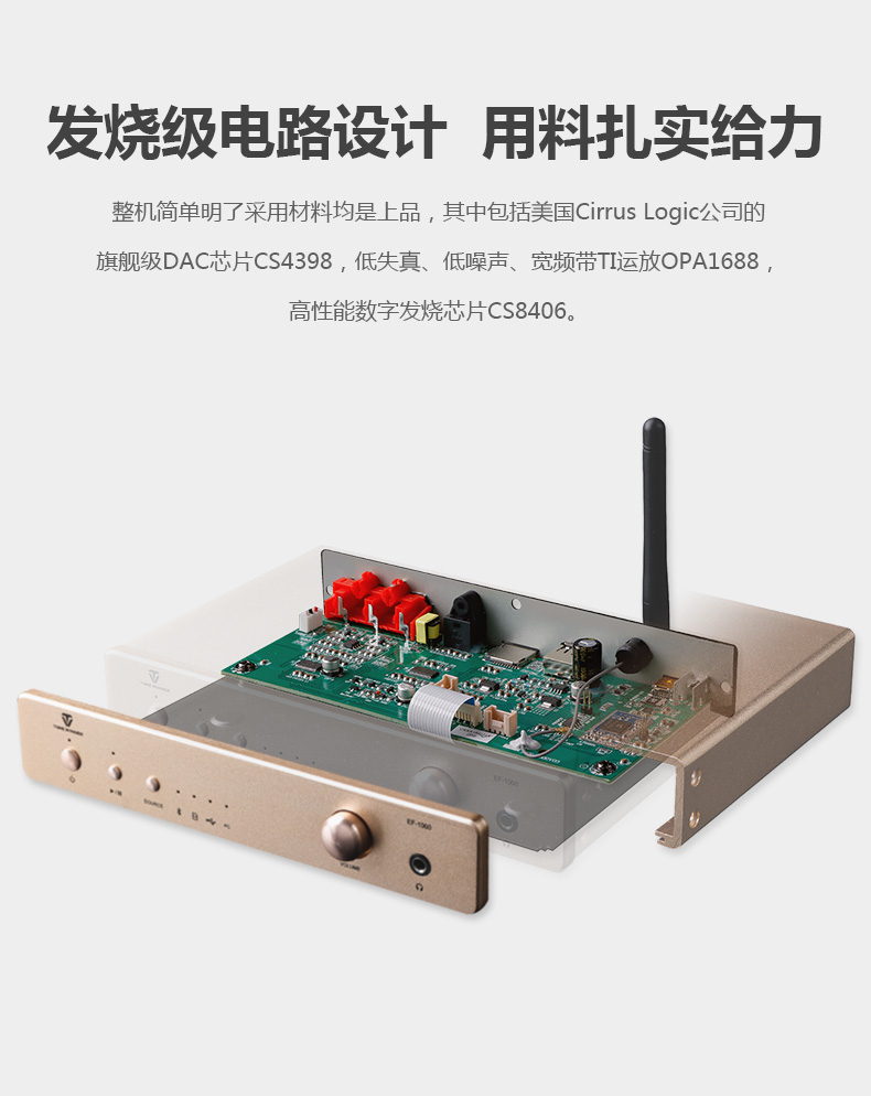 它也是一款高品質音頻解碼器。EF-1000采用HI-FI音頻設計方案,內置旗艦級DAC芯片CS4398,保證超強解析力,聲音溫暖細膩,富有情感,細節表現出色。因此它完全可以被用作一個高級音頻解碼器前級與Hi-Fi后級功放匹配。