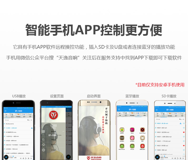 它更是擁天逸自主研發的具有強大功能和便捷操作的手機APP系統。EF-1000配備天逸音樂APP,兩者之間通過藍牙進行連接,APP可以讀取手機預設的音樂,從而播放手機本地歌曲;且可以管理跟連接播放設備,自由地切換音源。EF-1000還有完善的文件管理系統和我的最愛歌曲收藏功能,通過APP操作,可顯示TF卡或U盤內8層文件或歌曲名以及其文件路徑,并可一鍵添加至“我的最愛”收藏內。如此方便簡單的操作對于用戶來說無疑是一大福音。