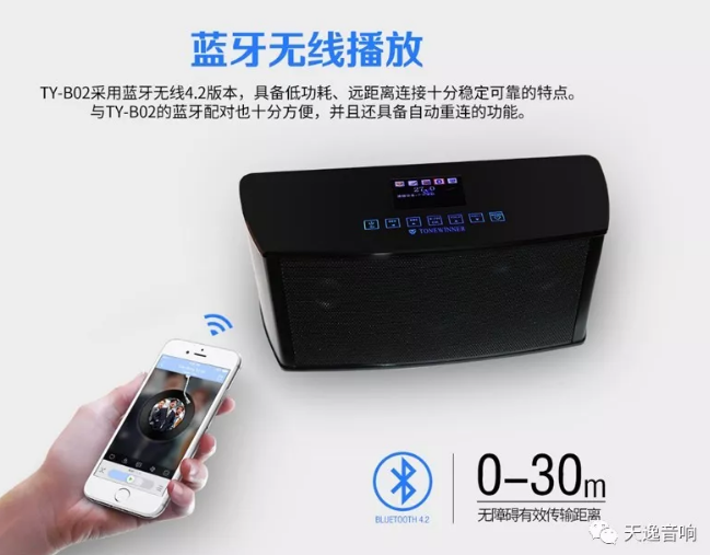【支持無線藍牙傳輸】TY-B02采用了先進的藍牙4.2配置,該藍牙芯片支持數字音頻輸出。相比普通藍牙版本,藍牙4.2版本在信號傳輸方面更加穩(wěn)定、距離更遠,藍牙回鏈的速度也更快,而且功耗更低。在與該音箱的藍牙配對時十分方便,且內置了自動重連功能,免除了用戶反復操作的煩惱。
