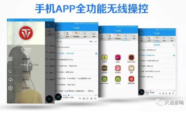【APP配置】除此以外,強大的TY-B02還配備手機APP!這是天逸專為高保真數碼產品開發(fā)的專用APP,版面簡潔、功能實用、操作簡單,是一款人性化的設計。(PS:用戶只需關注微信公眾號:天逸音響,點擊底部菜單【服務支持-APP下載】即可獲取安裝。)APP和音箱之間通過藍牙進行連接,它可以讀取手機預設的音樂APP,從而播放手機本地歌曲;通過它用戶可以管理跟音箱連接播放設備,自由地切換音源,以及控制音箱的音量大小等操作。如此方便簡單的操作對于用戶來說無疑是一大福音。