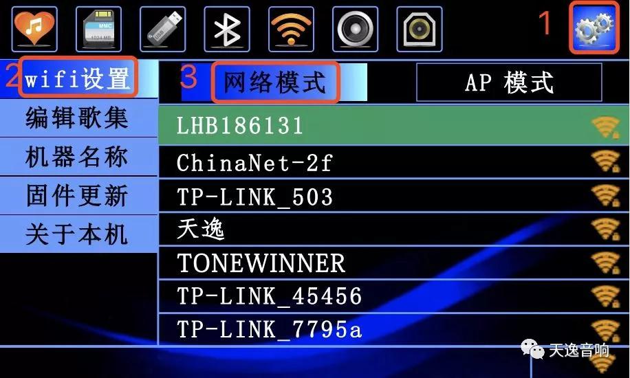 (1).播放器面板操作:光標(biāo)移動至【設(shè)置】鍵-【W(wǎng)i-Fi設(shè)置】-【網(wǎng)絡(luò)模式】-選擇家里的路由器并輸入密碼(圖中選擇的是LHB186131)